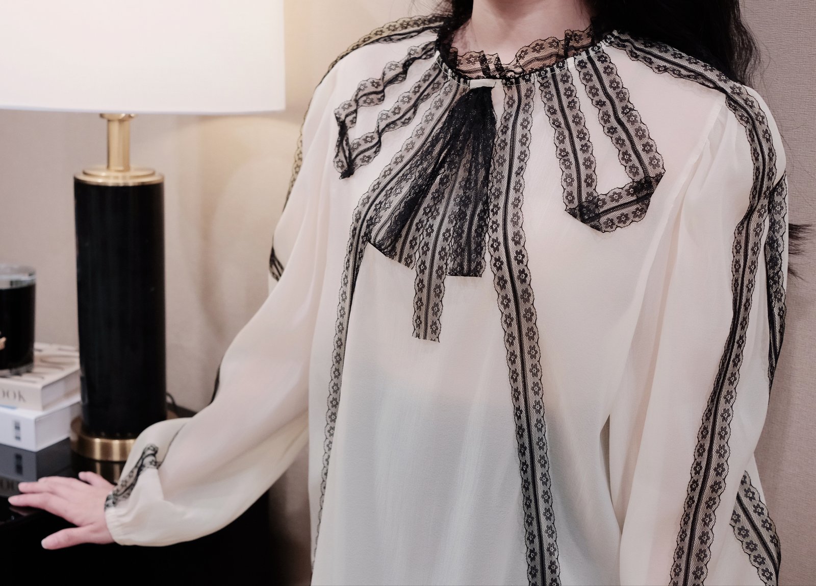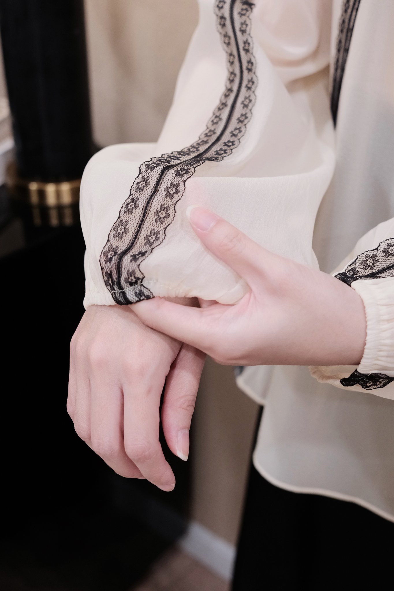 - Tay Dài Bo Chun Duyên Dáng: Tay áo dài, với độ phồng nhẹ nhàng ở vai và được bo chun tinh tế ở cổ tay, tạo hiệu ứng bồng bềnh, lãng mạn. Chi tiết viền trang trí cũng được lặp lại ở phần tay áo, mang đến sự đồng điệu và đẳng cấp cho tổng thể thiết kế, giúp tôn lên vẻ đẹp nữ tính và thanh lịch của người mặc.