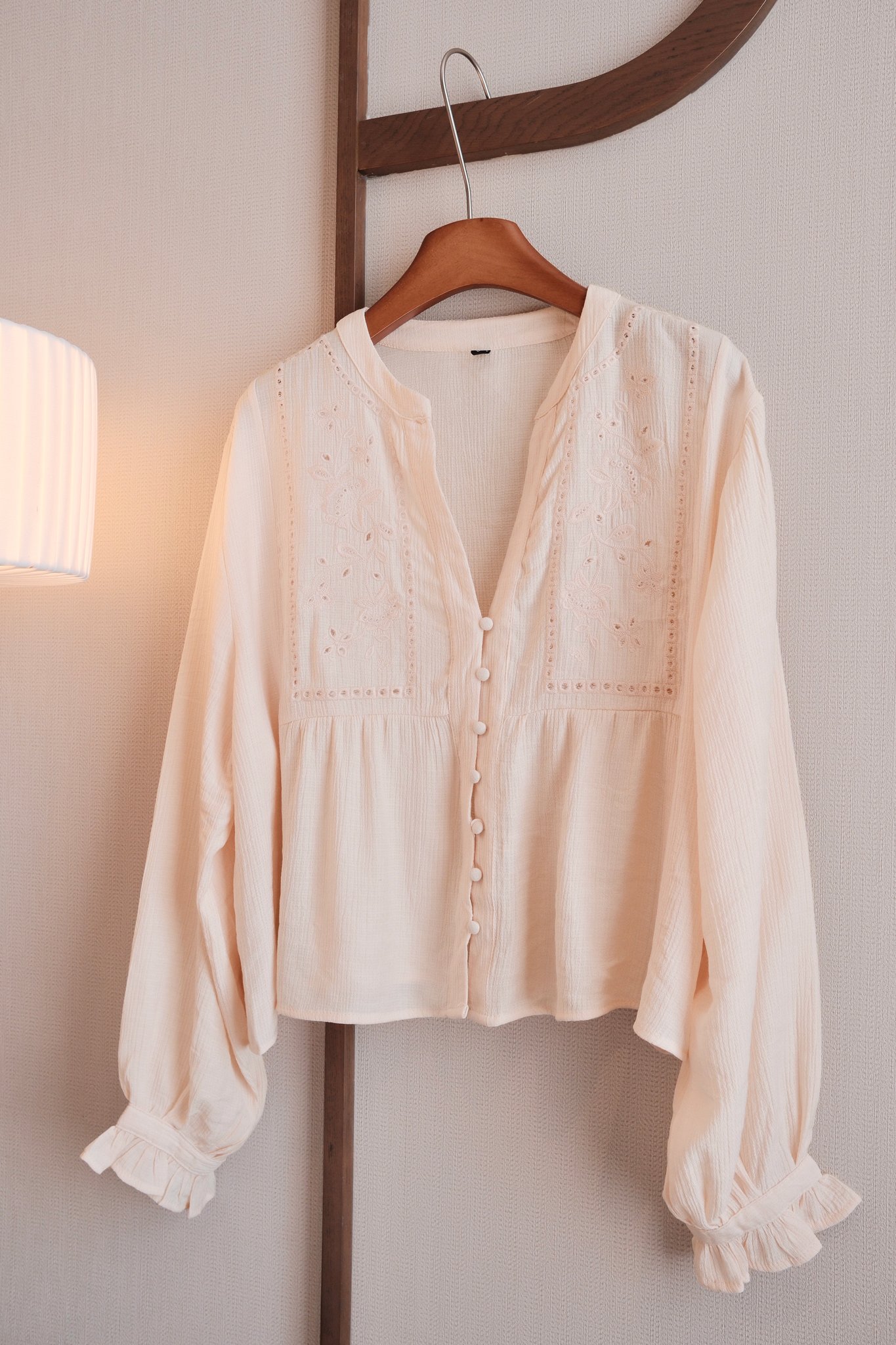 - Điểm nhấn đặc biệt của chiếc áo là họa tiết thêu hoa mềm mại, được thực hiện với sự khéo léo và tỉ mỉ trên nền vải.