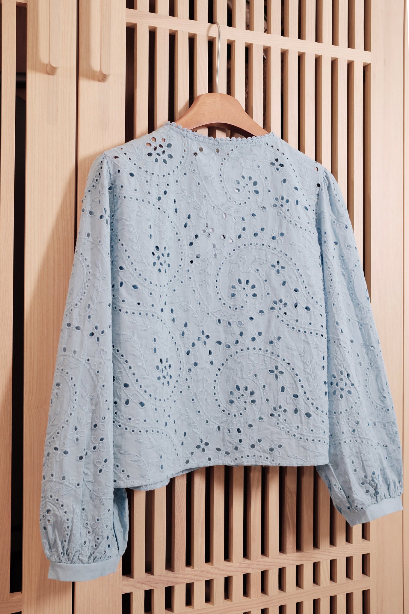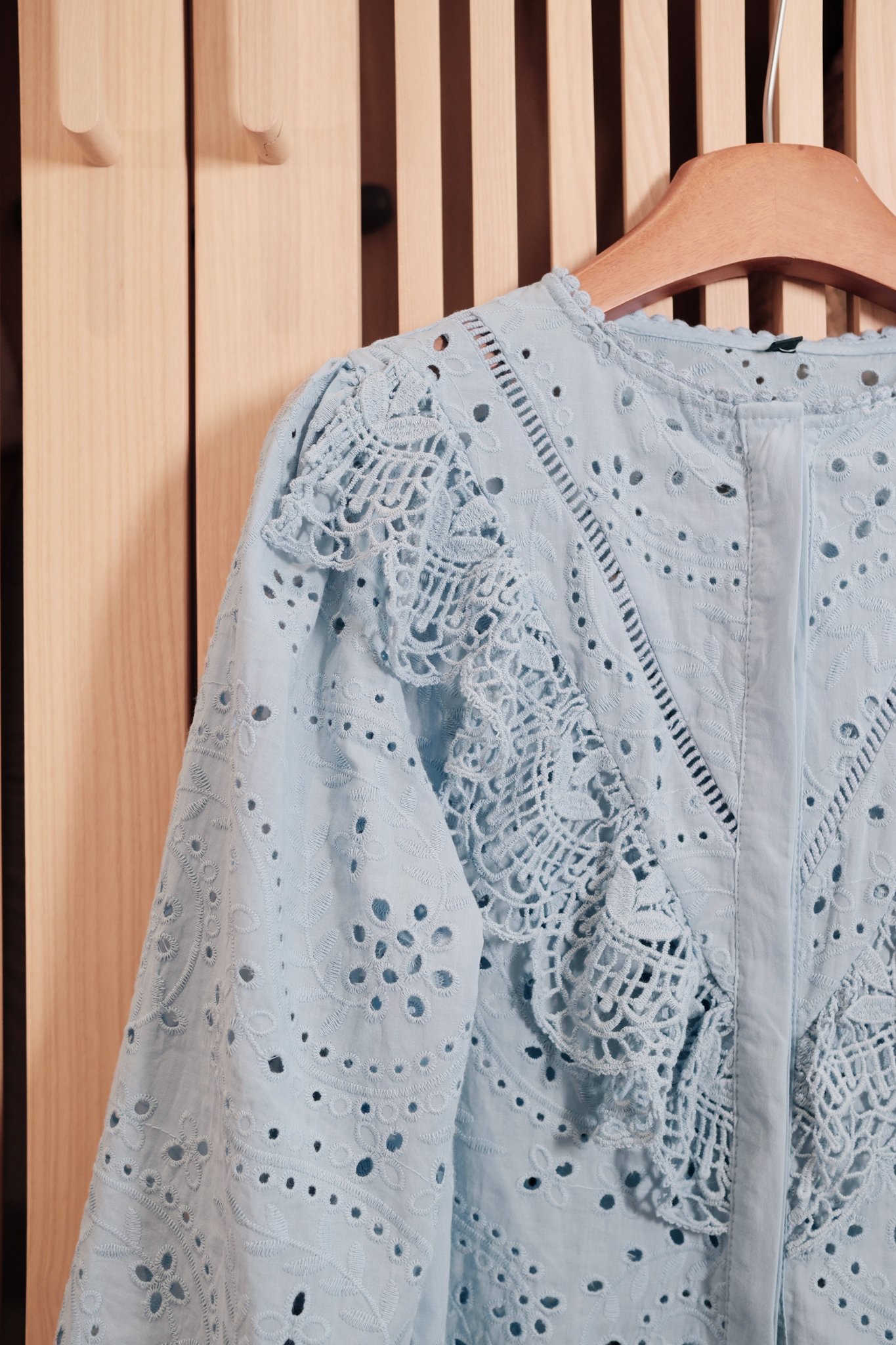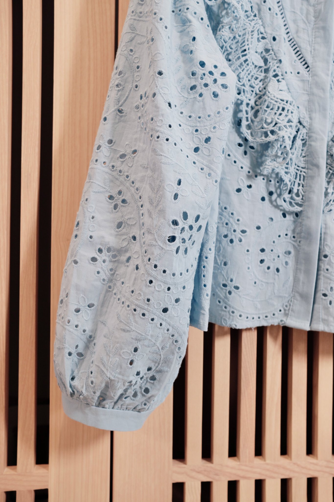 - Điểm nhấn làm nên sự khác biệt của chiếc áo chính là những họa tiết đục lỗ (eyelet) được sắp xếp khéo léo, kết hợp cùng các chi tiết thêu hoa tinh xảo.