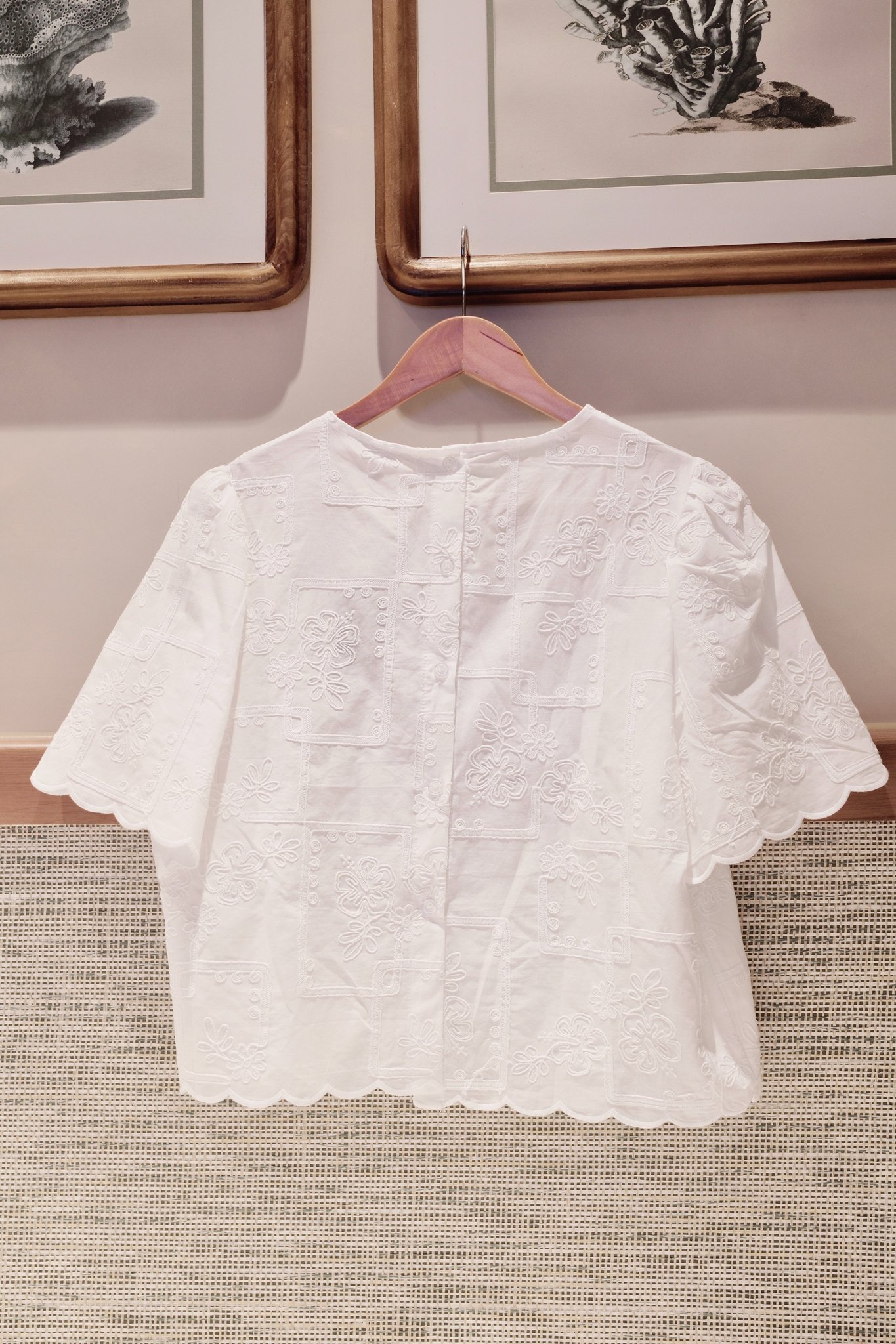 - Viền Cổ & Tay Áo Lượn Sóng (Scallop Edge): Đây là chi tiết đắt giá, tạo nên sự khác biệt và vẻ đẹp mềm mại, nữ tính. Viền lượn sóng không chỉ xuất hiện ở cổ mà còn ở phần ống tay ngắn, giúp chiếc áo thêm phần điệu đà, uyển chuyển và độc đáo, thu hút mọi ánh nhìn.
