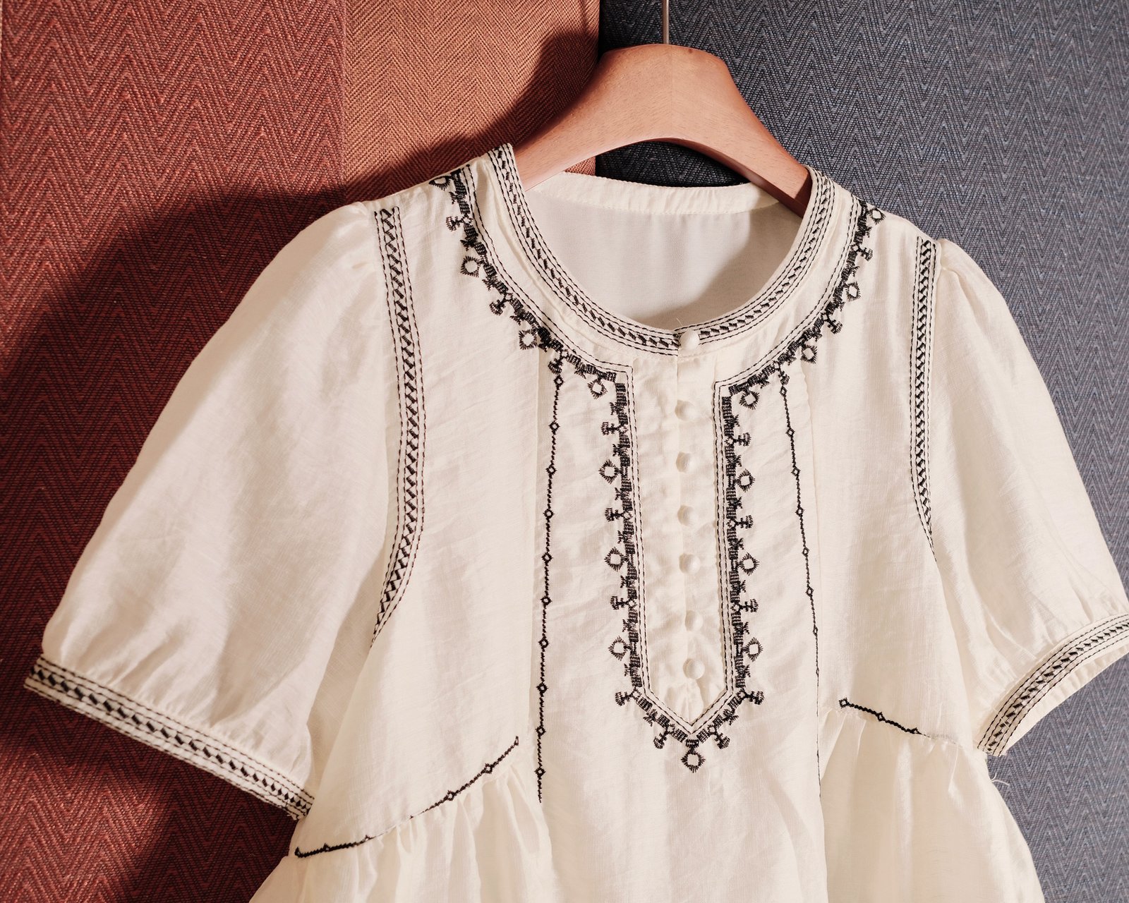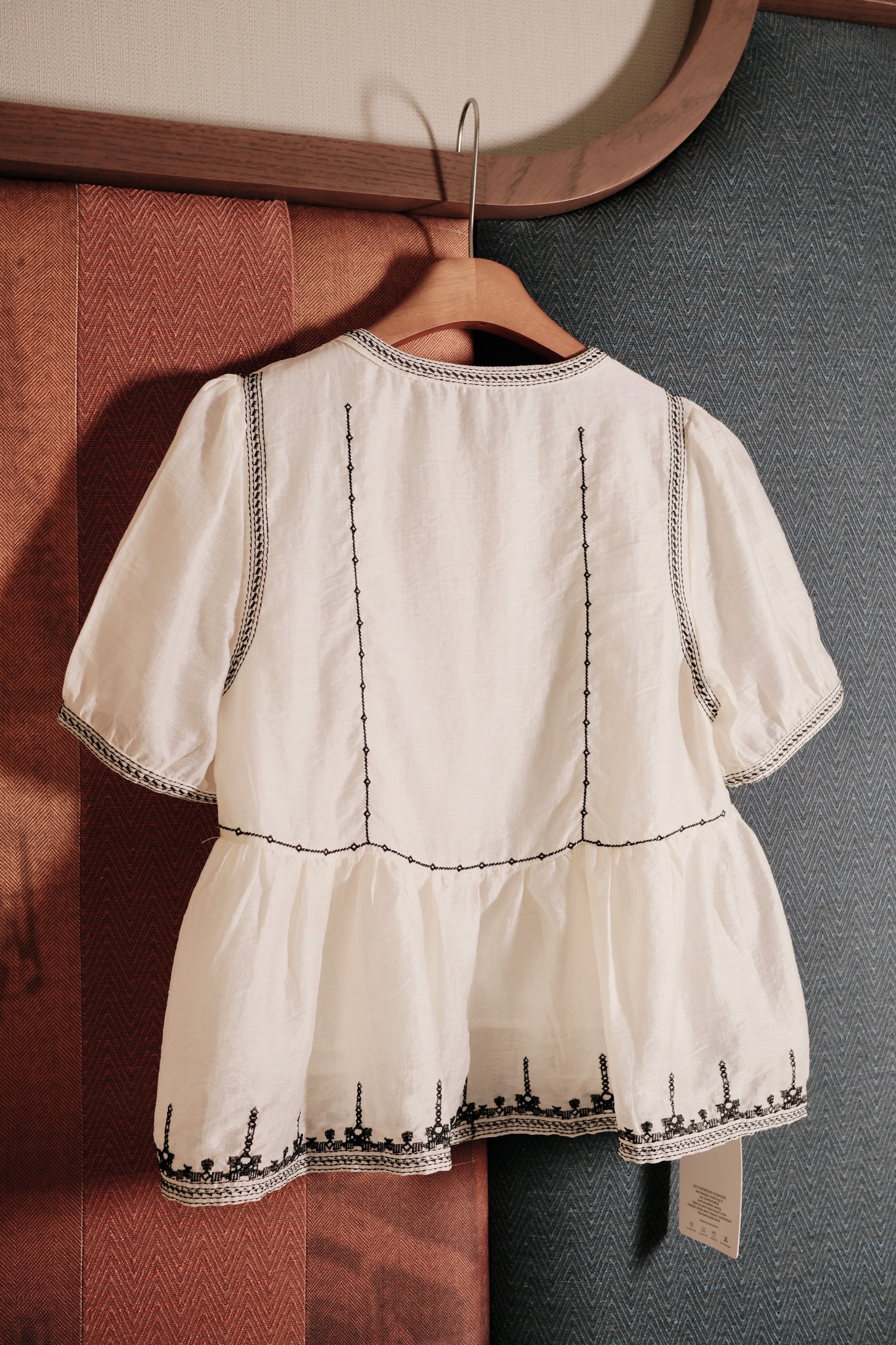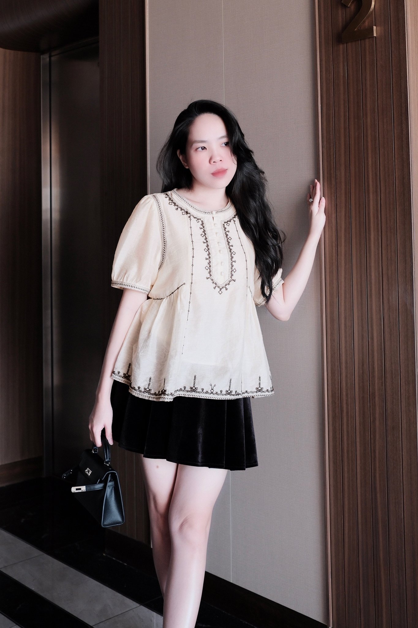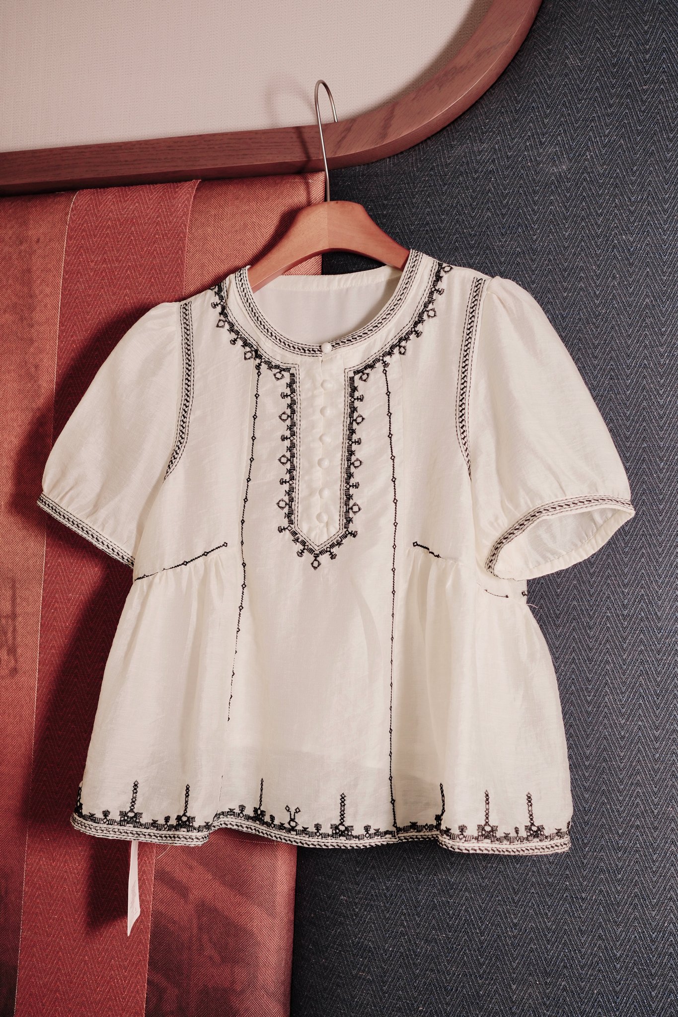 0ASM.00893.K.LÁo Sơ Mi Nữ Cổ Tròn Thêu Thổ Cẩm Tay Ngắn Dáng Rộng Phong Cách Bohemian Thanh Lịch