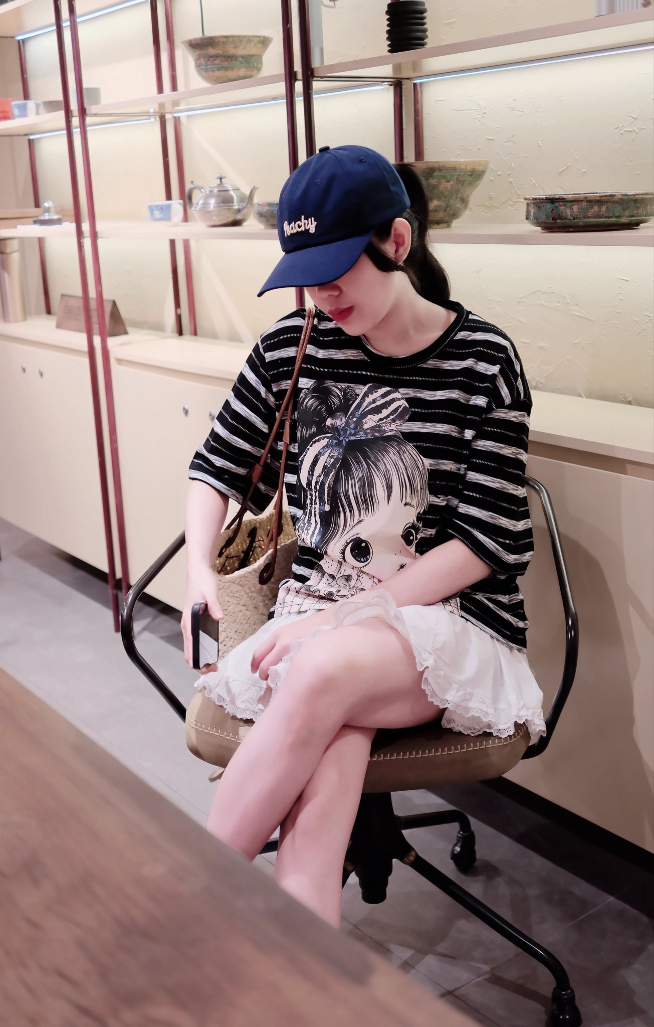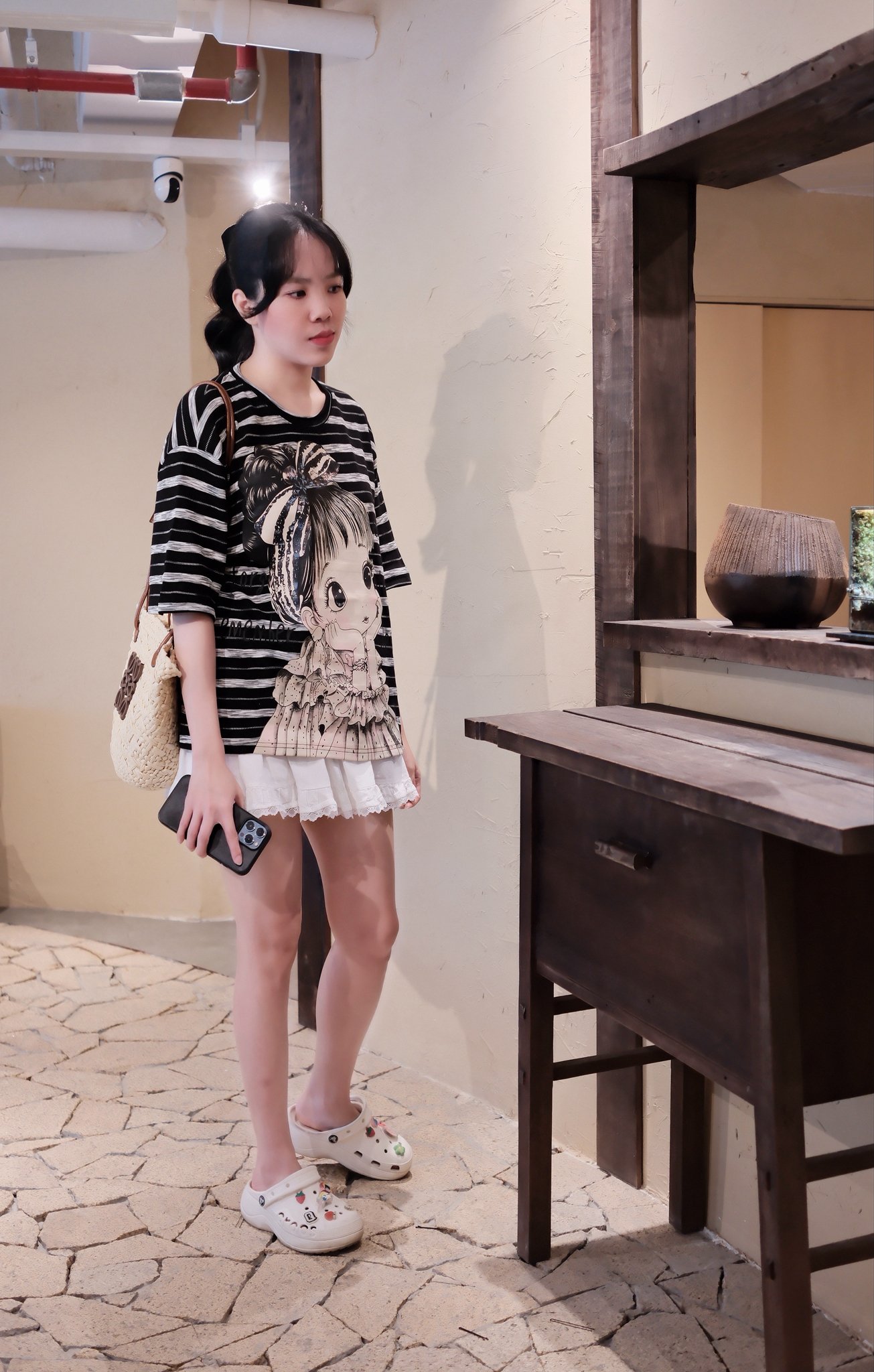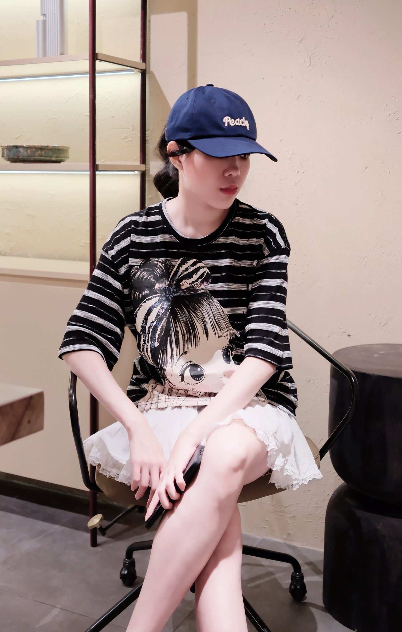 - Phối với chân váy: Để tạo vẻ ngoài nữ tính và điệu đà hơn, bạn có thể phối áo thun sọc in hình bé gái với chân váy.